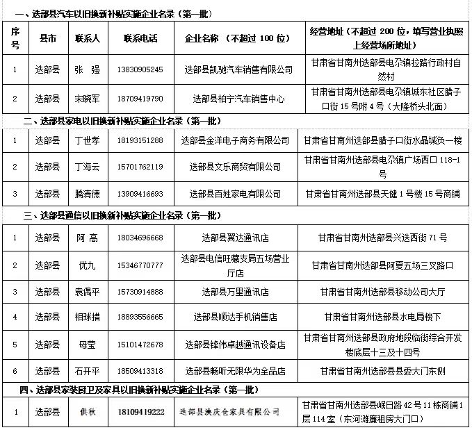 根据《甘肃省消费品以旧换新补贴实施企业名录(第一批)的公告》,现将迭部县入选全省2025年第一批参与实施消费品以旧换新补贴政策的企业名录(详见附件)予以公告。