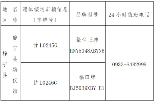 为了保障遗体运输工作的规范、安全与有序,现将静宁县殡仪馆用于遗体接运服务的专用车辆详细信息予以公告,以便有需要的单位和个人能够及时了解并联系使用。以下是具体的车辆及服务相关信息: