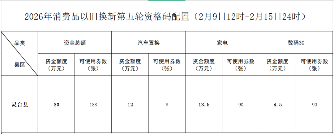 关于2026年消费品以旧换新灵台县第五轮资格码配置计划的公告