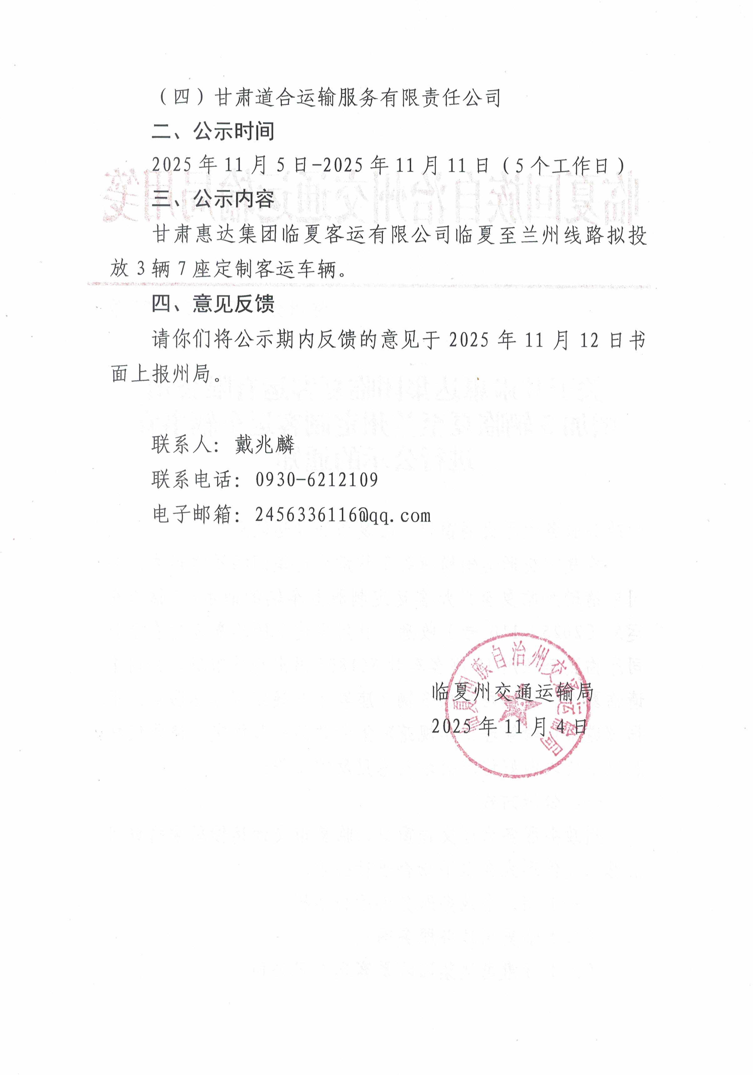 临州交函〔2025〕173号关于甘肃惠达集团临夏客运有限公司增加3辆临夏至兰州定制客运车辆事宜进行公示的通知