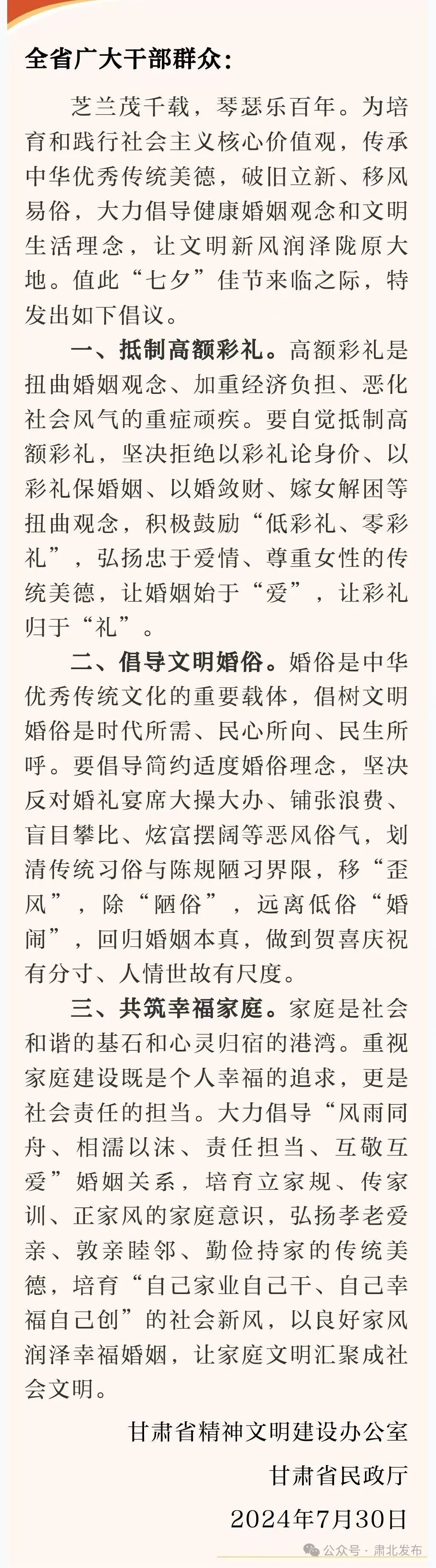 甘肃省“抵制高额彩礼 倡导文明婚俗”倡议书