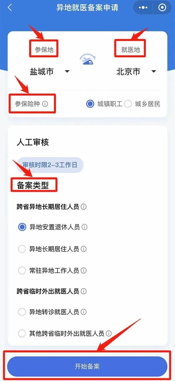3.根据自己的实际情况选择参保地、就医地、参保险种、备案类型,最后点击“开始备案”;