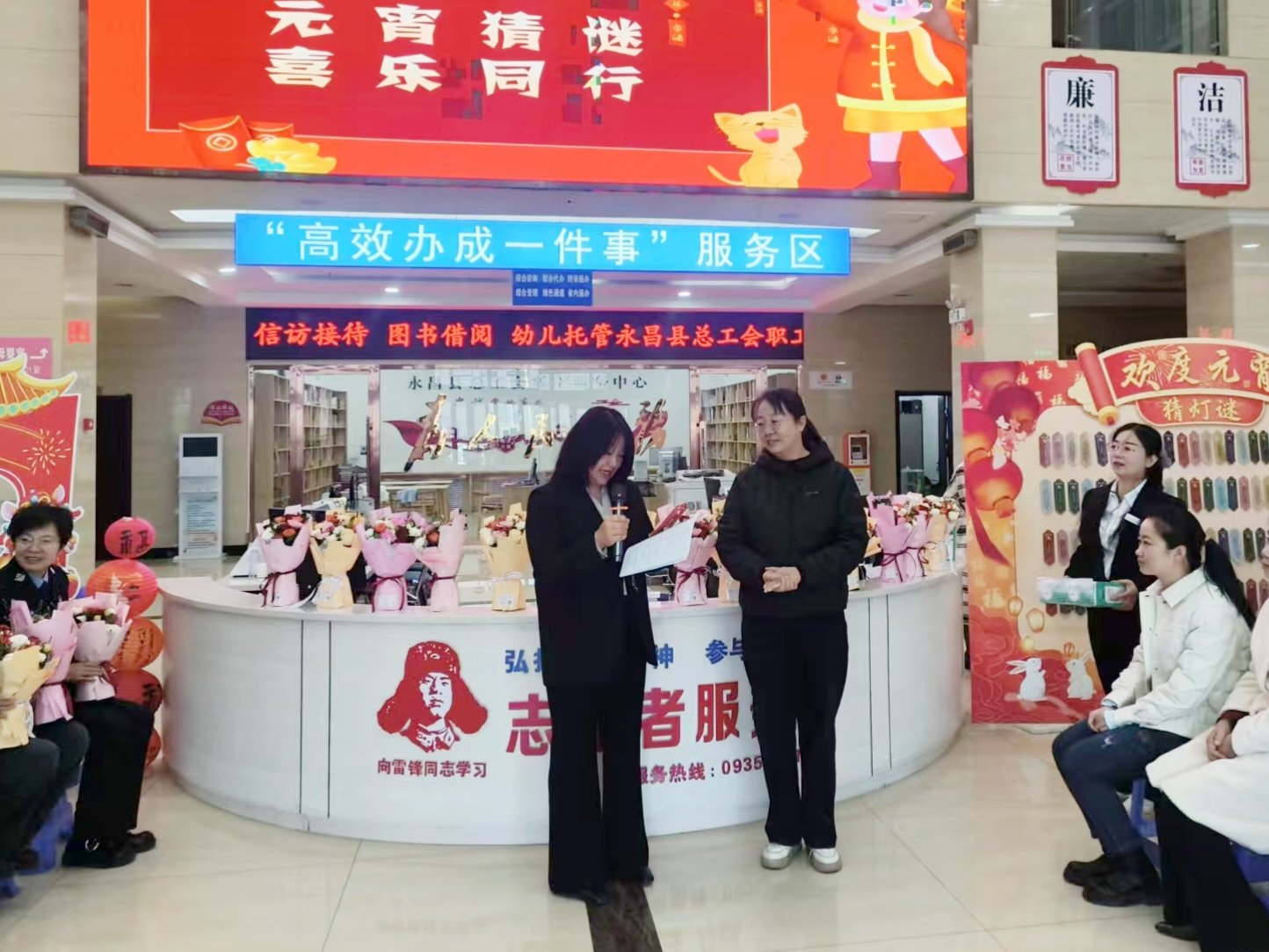 春潮涌动暖三月,巾帼芳华绽新颜。第116个“三八”国际劳动妇女节与农历正月十五元宵节双节交汇之际,永昌县政务服务中心于2026年3月3日上午,在一楼大厅举办“政务温情暖巾帼,元宵喜乐庆三八——致敬每一位发光的政务女性”系列活动。县妇联、县总工会有关负责人受邀出席,中心全体工作人员、窗口及后台审批人员与办事群众共赴盛会,共庆双节、共话担当。