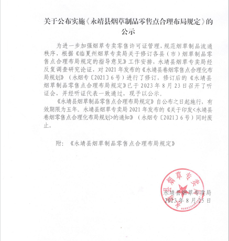 关于公布实施《永靖县烟草制品零售点合理布局规定》的公示