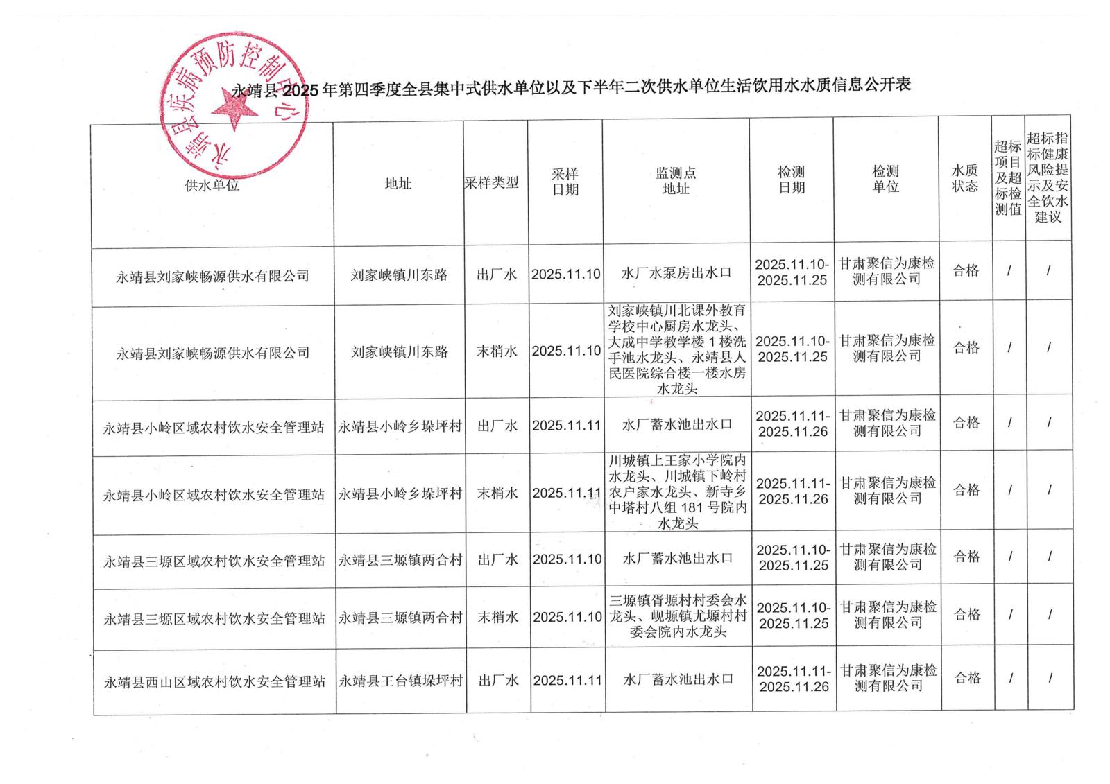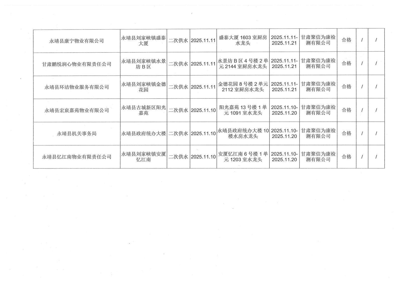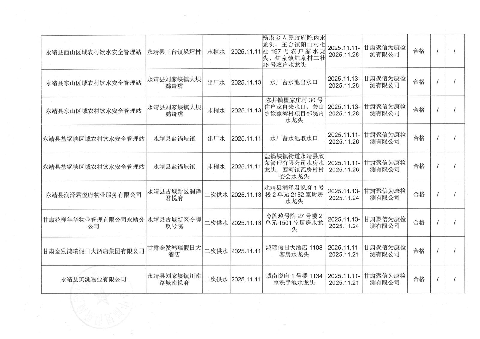 为进一步加强全县居民生活饮用水水质监测,保障人民群众生活用水安全,根据甘肃省卫生健康委员会《关于印发甘肃省疾病预防控制机构生活饮用水卫生监测工作指导方案的通知》(甘卫疾控发〔2023〕78号)以及临夏州卫健委《关于印发<临夏州疾病预防控制机构生活饮用水卫生监测工作实施方案>的通知》(临州卫〔2023〕135号)的水质监测结果公示要求,对全县6家集中式供水单位出厂水及管网末梢水水质检测结果进行公示,包括出厂水6份,管网末梢水15份,其中城镇4份,农村17份,监测项目38项(PH值、色度、浑浊度、臭和味、肉眼可见物、高锰酸盐指数、硝酸盐(以N计)、氯酸盐、亚氯酸盐、溴酸盐、氯化物、氰化物、氟化物、硫酸盐、溶解性总固体、总硬度(以CaCO3计)、氨(以N计)、游离氯(二氧化氯)、六价铬、砷、镉、铅、汞、铝、铁、锰、铜、锌、三氯甲烷、一氯二溴甲烷、二氯一溴甲烷、二氯乙酸、三氯乙酸、三卤甲烷、三溴甲烷、总大肠菌群、大肠埃希氏菌、菌落总数,其检测结果均符合《生活饮用水卫生标准》GB5749-2022的规定。对全县1家事业单位、1家酒店、8家物业公司总计10份二次供水水质检测结果进行公示,监测项目21项(色度、浑浊度、臭和味、肉眼可见物、PH值、氯化物、总硬度、氨(以N计)、高锰酸盐指数、挥发酚类、亚硝酸盐氮、六价铬、氰化物、硝酸盐、砷、铁、锰、铅、总大肠菌群、细菌总数、游离氯),其检测结果均符合国家《生活饮用水卫生标准》GB5749-2022的规定。