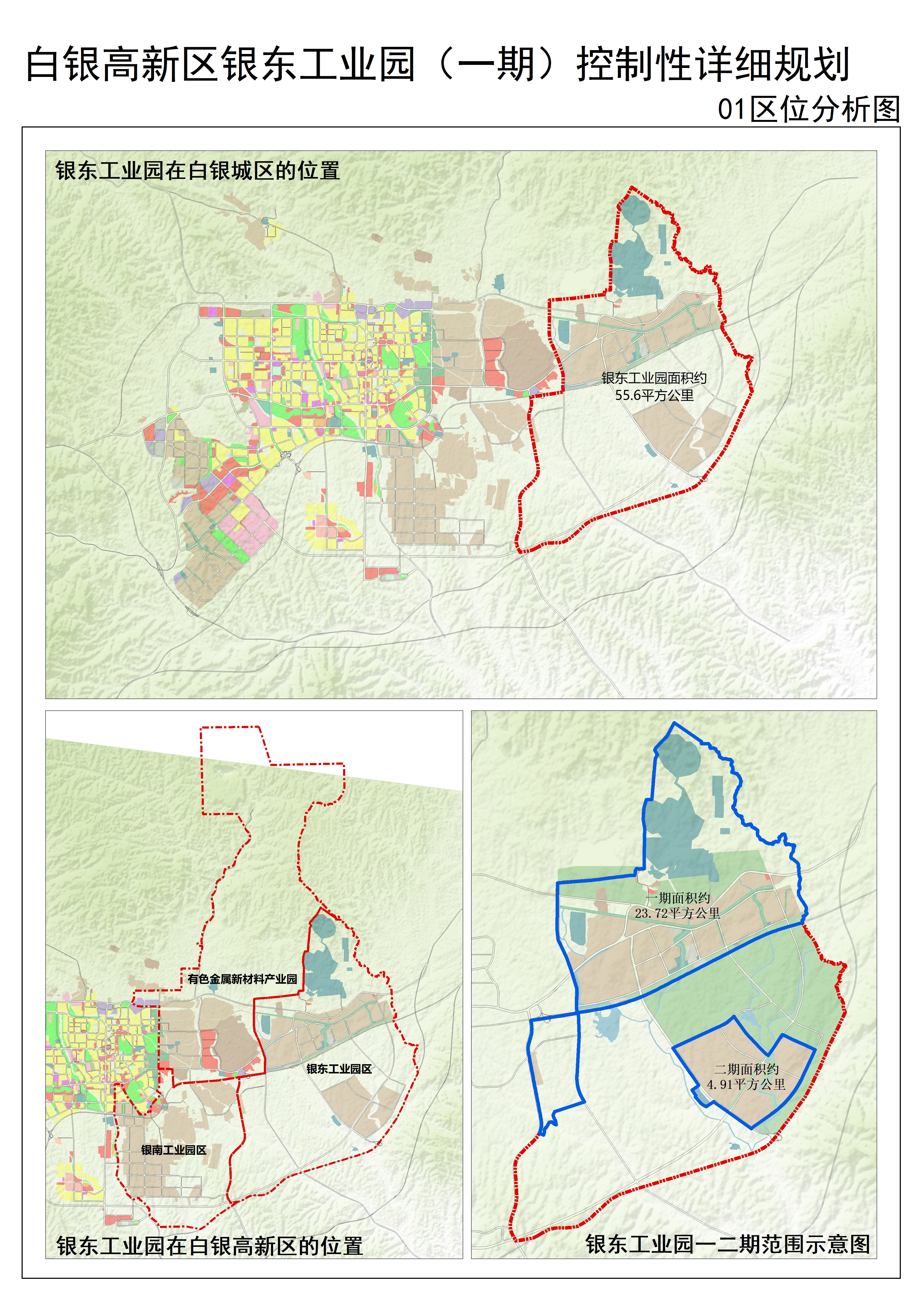 银东工业园面积约55.6平方公里,规划银东工业园一期范围23.72平方公里,北至规划一般工业固废(建筑垃圾填埋场)北侧、南至京藏高速、东至白银区行政区划东边界、西至沿黄快速通道。