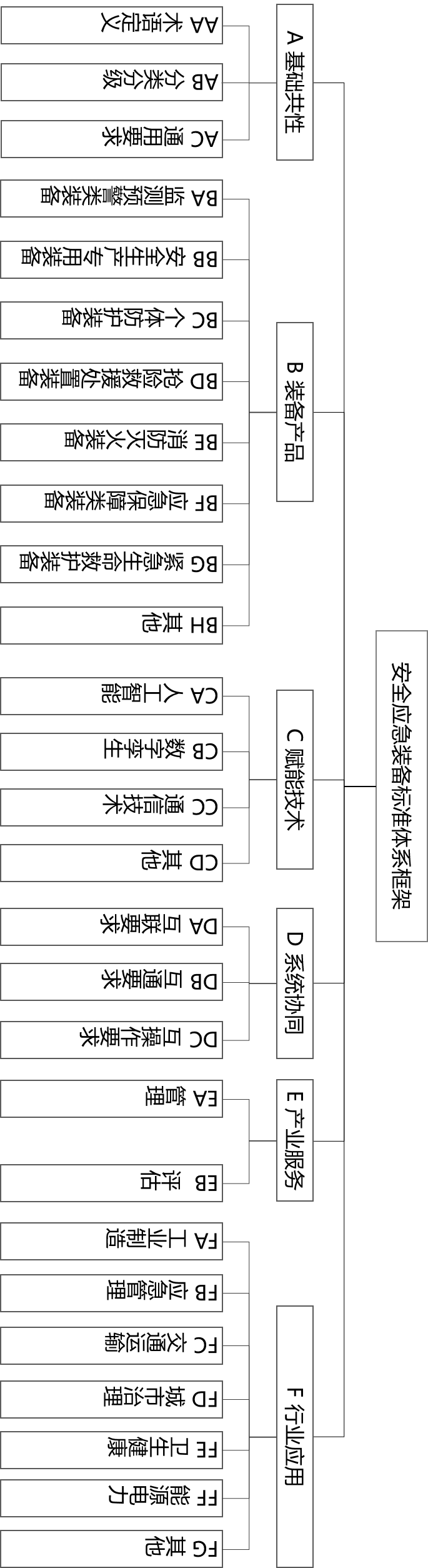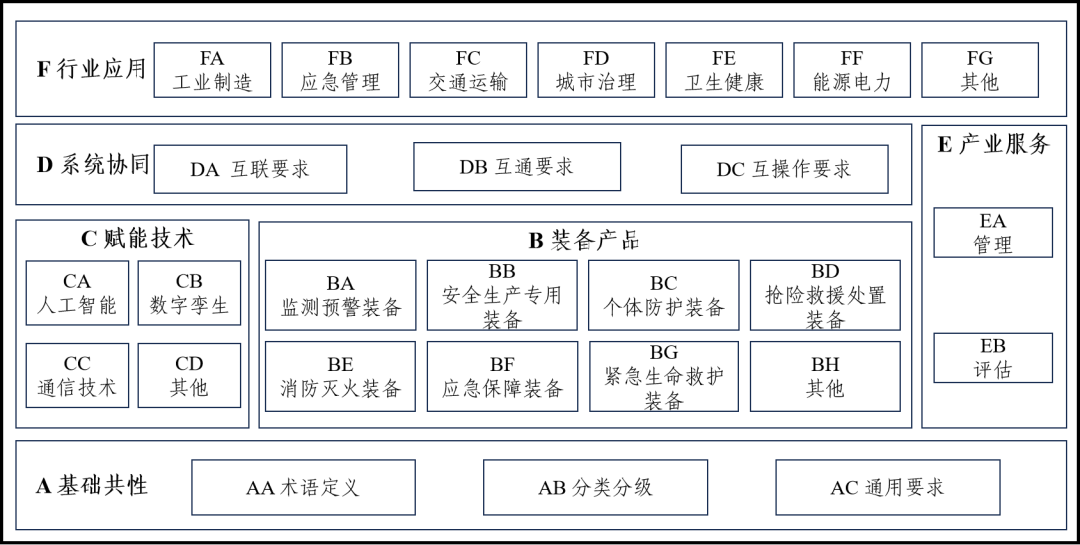 安全应急装备标准体系结构包括“A基础共性”“B装备产品”“C赋能技术”“D系统协同”“E产业服务”“F行业应用”等6个部分,主要反映标准体系各部分的组成关系。安全应急装备标准体系结构图如图1所示。