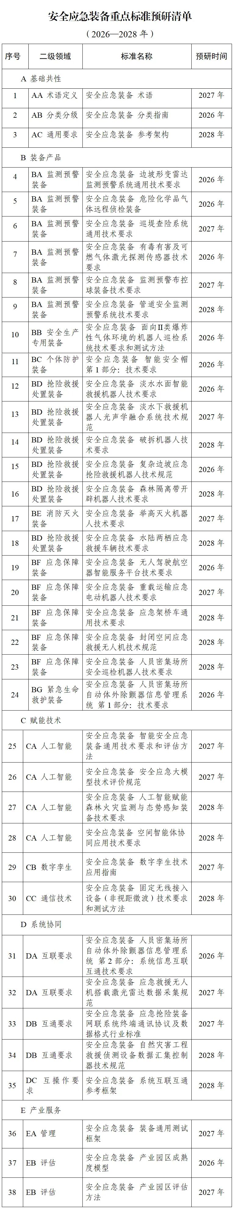 到2028年,基本形成适应安全应急装备产业创新发展需要的标准体系,累计制修订38项以上国家层面标准,提升安全应急装备标准公共服务能力,促进产业高质量发展。