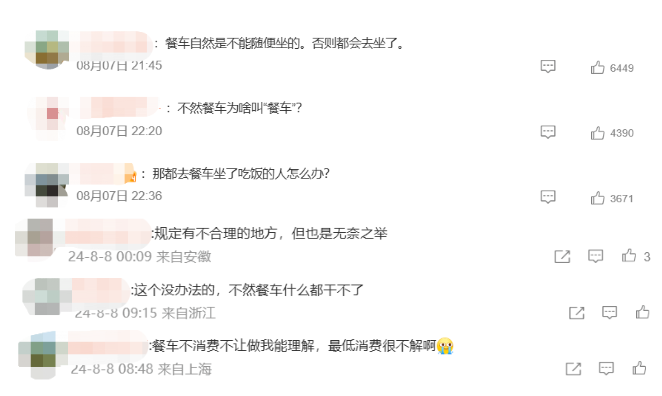 餐车仅限消费就座,且设置最低消费。就此,有人对这一规定表示理解,“餐车自然是不能随便坐的,否则都会去坐了”“这个没办法的,不然餐车什么都干不了”;也有网友表示,“餐车不消费不让坐我能理解,最低消费很不解。”