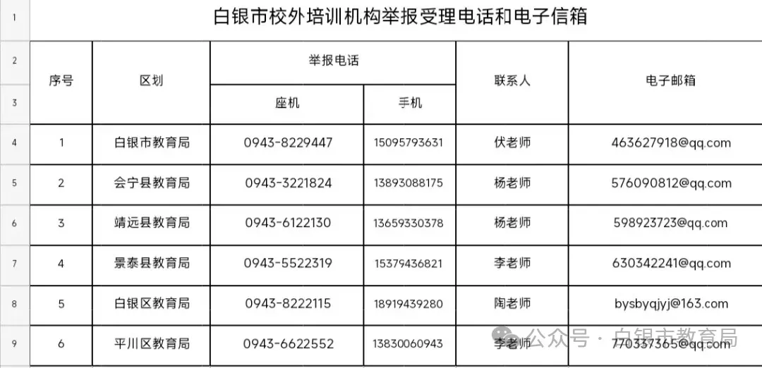 白银市校外培训机构举报受理电话和电子信箱白银市校外培训机构“白名单”(截止2025年1月8日)