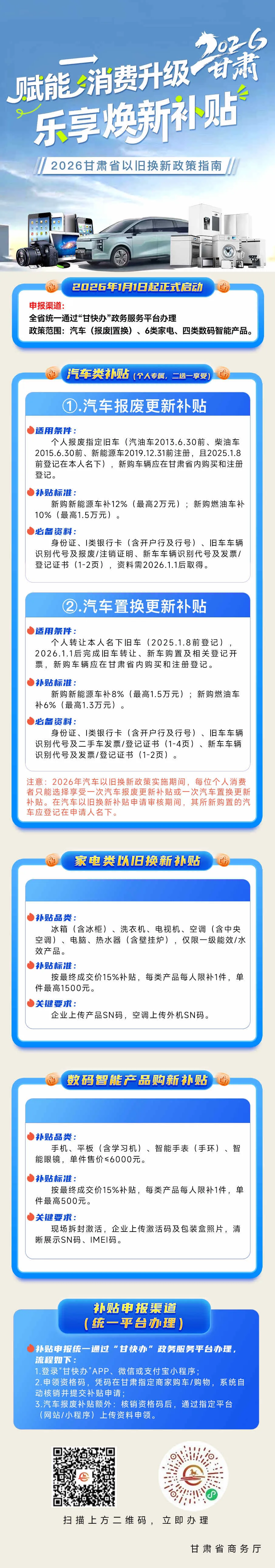 据甘肃省商务厅消息,1月1日起,甘肃2026消费品以旧换新补贴政策正式实施。汽车类最高补2万元;家电类享受15%补贴,单件最高补贴1500元;数码类享受15%补贴,单件最高补贴500元。