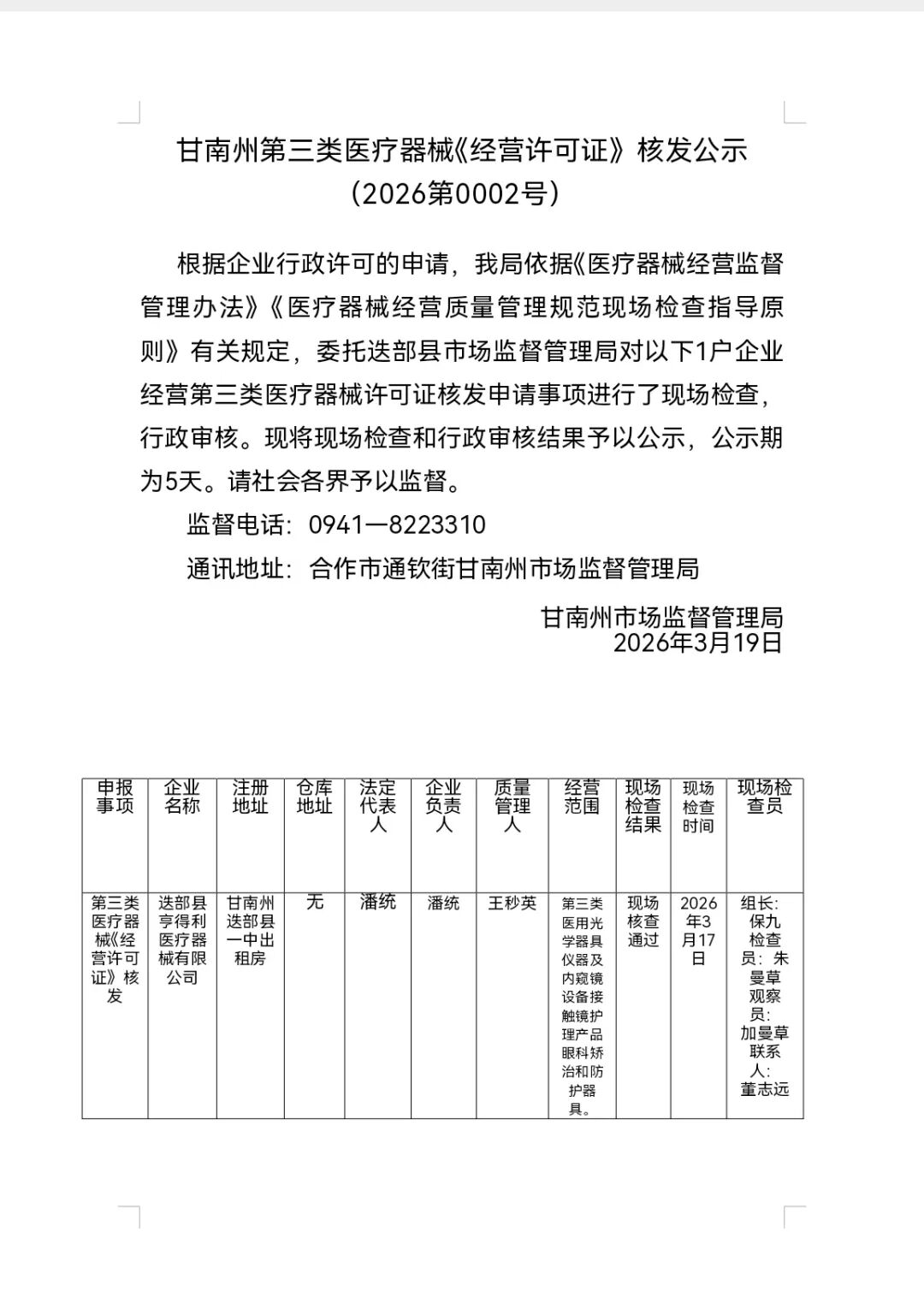 甘南州第三类医疗器械《经营许可证》核发公示(2026第0002号)