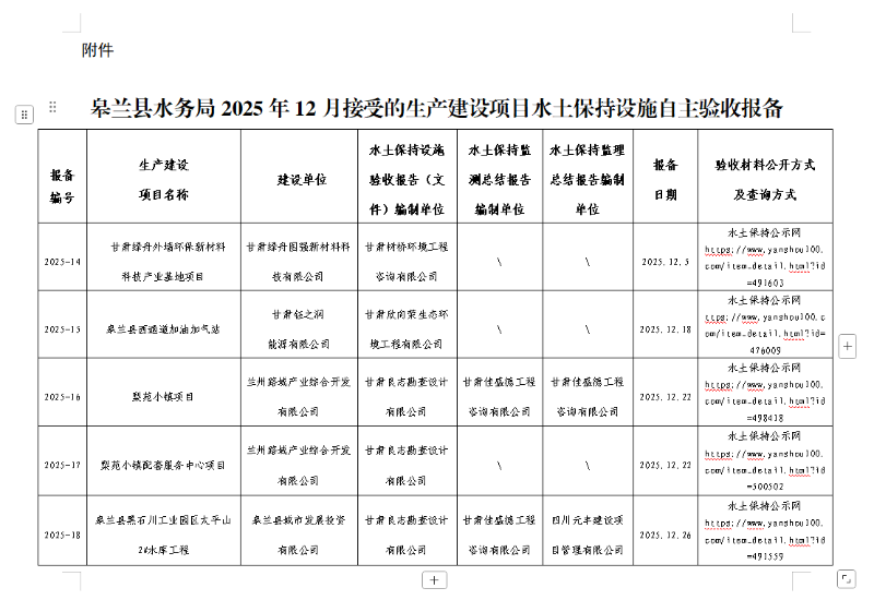 根据《水利部关于加强事中事后监管规范生产建设项目水土保持设施自主验收的通知》(水保〔2017〕365号)、《甘肃省水利厅关于印发〈加强事中事后监管规范生产建设项目水土保持设施自主验收实施意见〉的通知》(甘水水保发〔2017〕381号)的有关规定,2025年12月份我局接受了5个生产建设项目水土保持设施自主验收报备。现将有关情况予以公告,公告期为2026年1月1日-2026年1月31日。