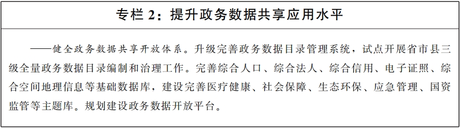 (三)健全政务数据共享体系。围绕“高效办成一件事”,推动以查询、核验、批量交换等多元化方式开展政务数据共享,建立跨层级、跨地域、跨系统、跨部门、跨业务政务数据共享和业务协同体系,扩大政务数据共享交换覆盖范围。升级完善省、市政务数据共享交换平台,加速推进县域政务数据汇集,强化国家、省、市三级政务数据共享交换平台联动,推进跨层级政务数据回流。建立跨系统信息共享机制,推动省级部门信息系统和省数据共享交换平台数据库互通共享。推动主动共享与按需共享相结合,定期发布政务数据共享责任清单。