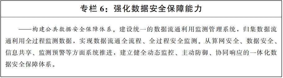 (十九)提升数据安全保障能力。加强公共数据可信采集、加密传输、可靠存储、受控交换共享、实时分析、智能应用、销毁确认及存证溯源等环节的安全技术支撑,有效规避数据隐私泄露、违规滥用等风险。推动“数盾”体系试点示范工程建设,提升数据汇聚关联风险识别和管控水平。培育数据流通安全检测、评估、审计、公证等第三方专业服务机构,壮大数据安全治理服务规模,提升安全服务效能。探索运用数据沙箱等技术,构建鼓励创新、弹性包容的治理环境。