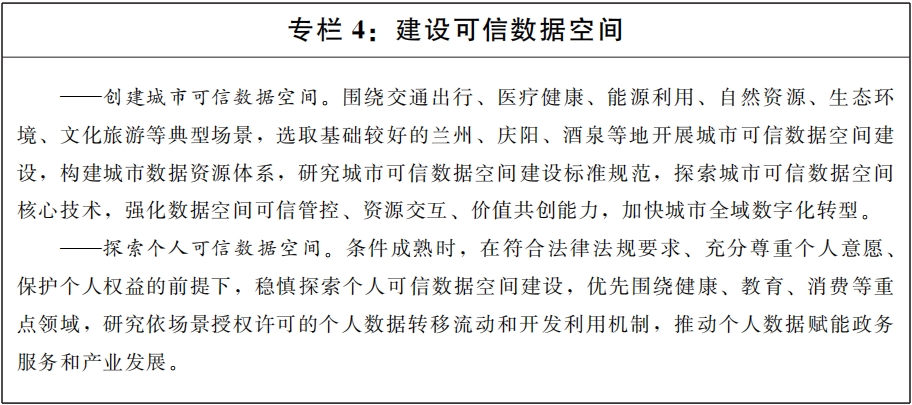 (十一)建设公共数据流通利用基础设施。根据国家政策文件规定,探索城市、个人等可信数据空间建设,鼓励建设数联网、数据元件等数据流通基础设施,促进数据高效便利可信流通。围绕工业制造、现代农业、医疗健康、绿色低碳等重点行业领域,探索数据基础设施技术路线试验,为国家数据基础设施建设贡献“甘肃方案”。推动省内数据基础设施规则、管理、标准相通相容,促进跨区域跨层级设施互联、能力互通,实现数据利用方式向共享汇聚和应用服务能力并重的方向转变。