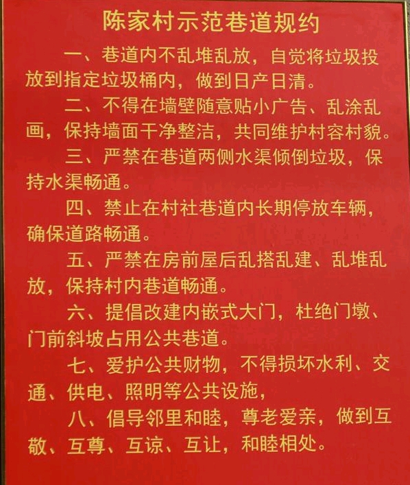 如今走进陈家村,曾经狭窄逼仄的巷道已焕然一新。统一规范的内嵌式大门整齐排列,路面宽阔平坦,再无杂物堆积。村民们不仅主动改造大门,还自发制定了门前环境卫生公约:“垃圾不乱堆,收拾完及时清”,大家互相监督,共同维护巷道环境。