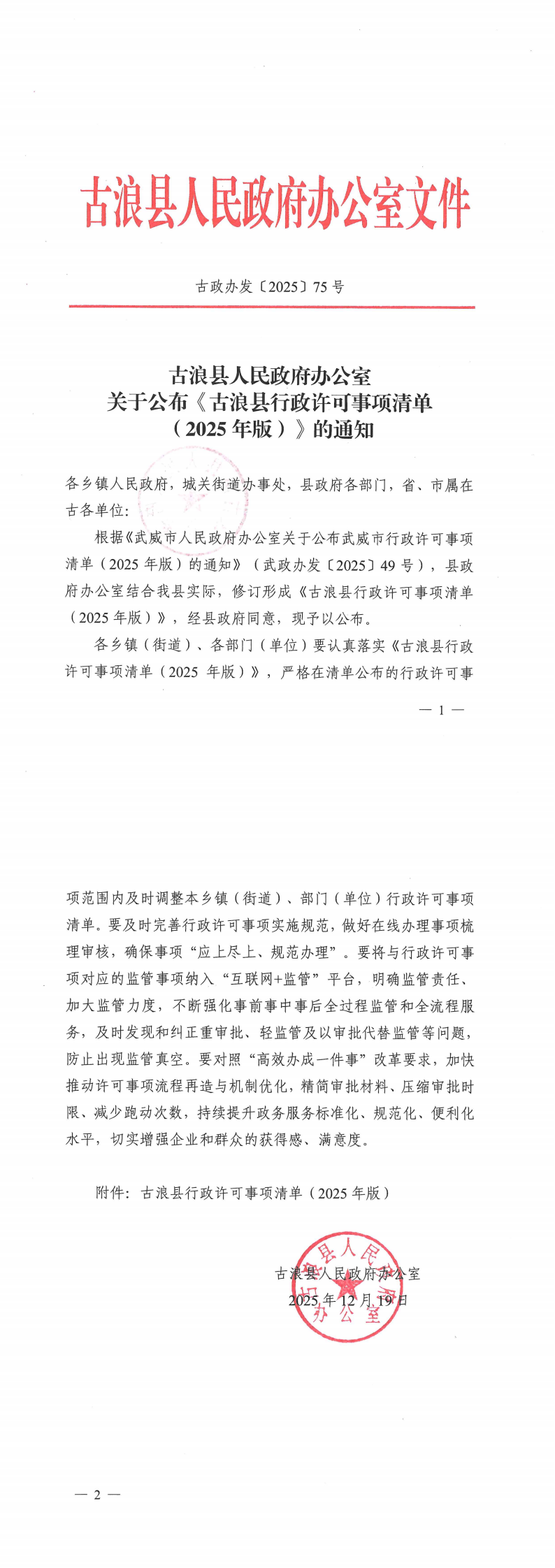 古浪县人民政府办公室关于公布《古浪县行政许可事项清单(2025年版)》的通知