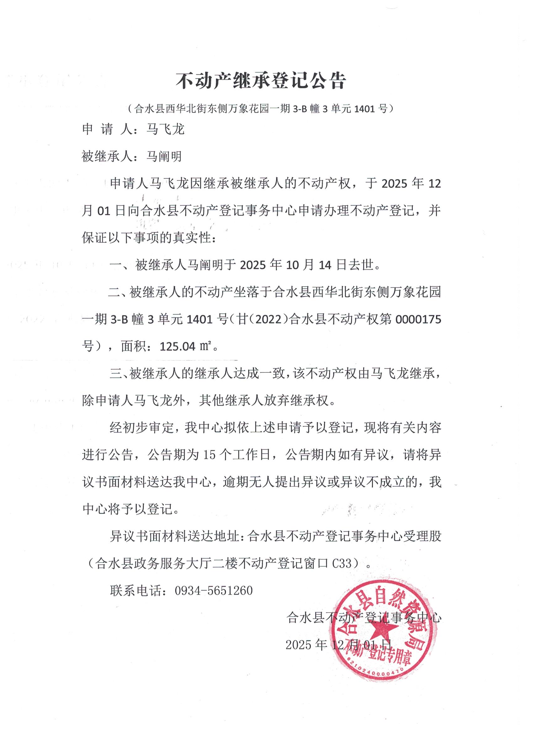 马阐明不动产继承登记公告