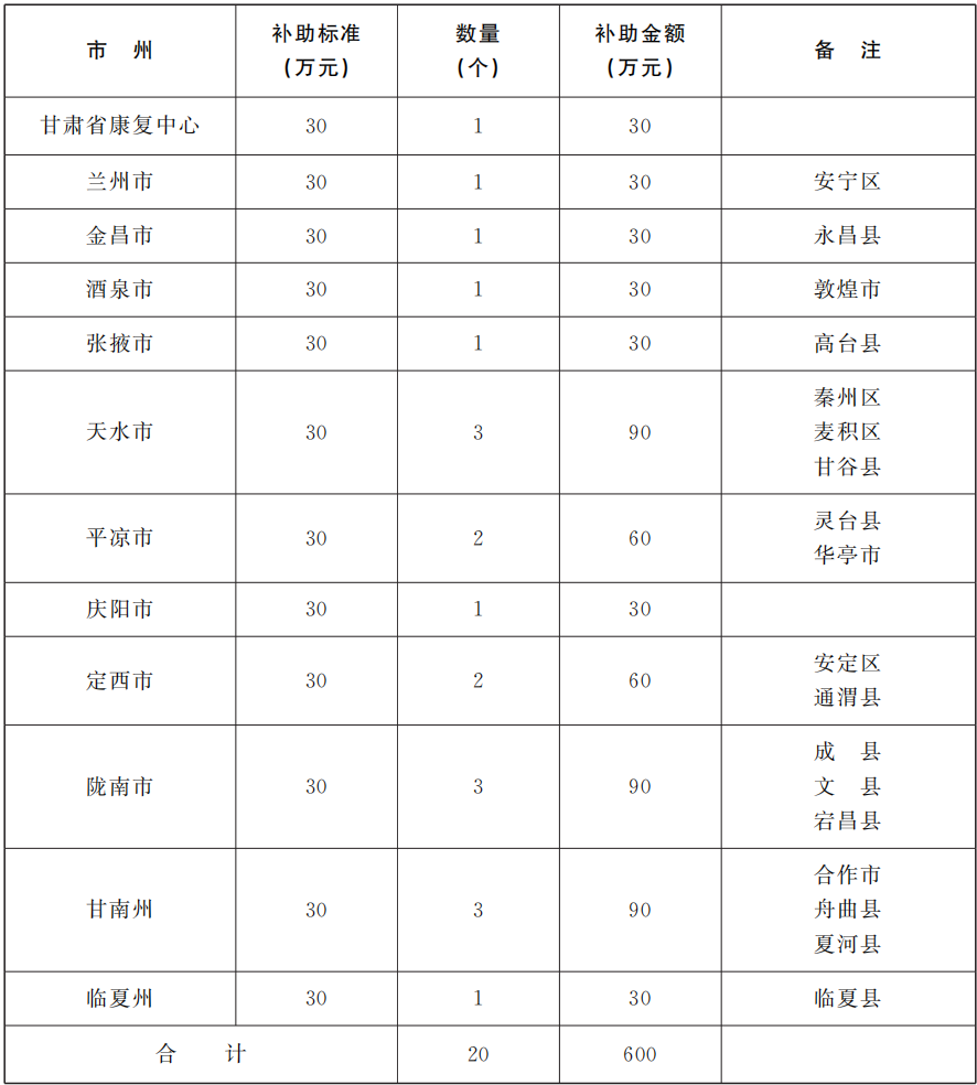 (三)资金安排。省级财政安排资金600万元,每个残疾人日间照料服务省级示范中心补助30万元,一次性下达到项目所在县(市、区)、省康复中心。县(市、区)、省康复中心可根据实际,安排支持资金。
