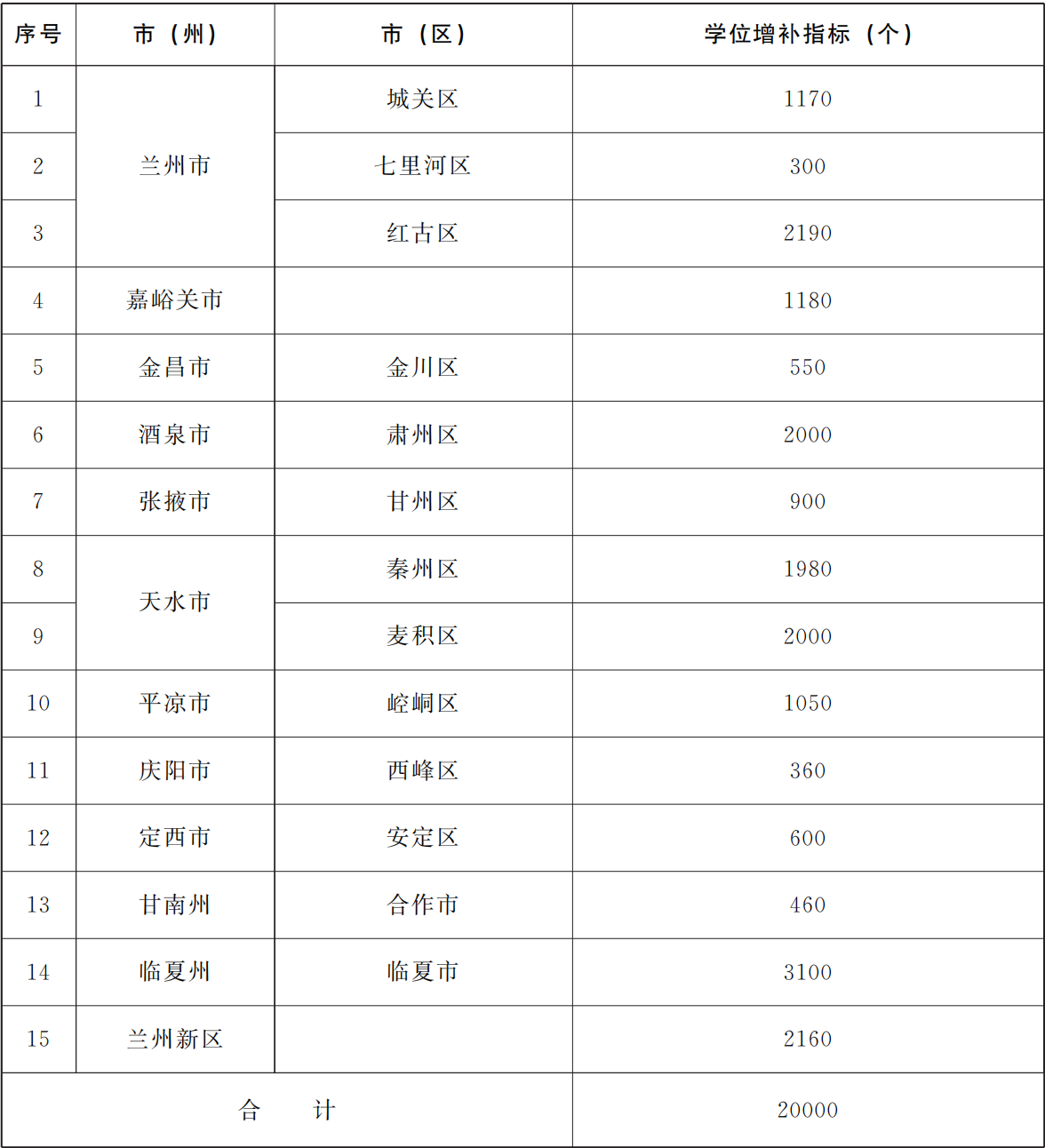 (二)在有建设需求且具备项目完成条件的市(州)城区和兰州新区增补义务教育阶段学位2万个。