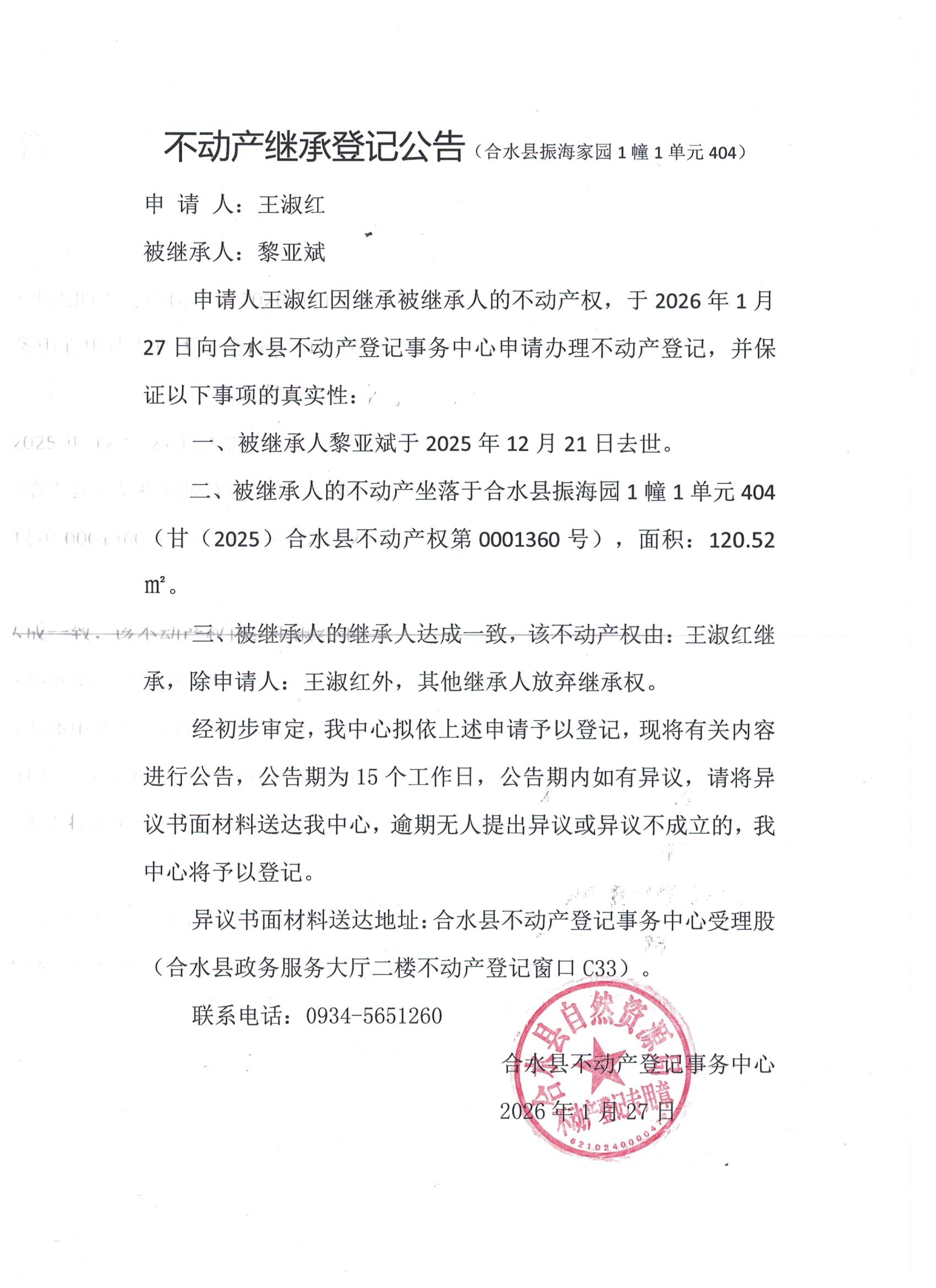 黎亚斌不动产继承公告