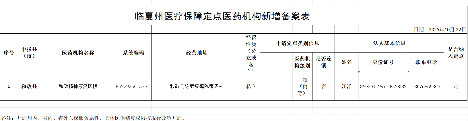 根据《医疗机构医疗保障定点管理暂行办法》(国家医疗保障局令第2号令)、《零售药店医疗保障定点管理暂行办法》(国家医疗保障局令第3号令)和《临夏州医疗保障定点医药机构协议管理经办规程》(临州医保发[2024]1号)精神,经县医保局受理、初审,州医保中心对初审资料进行了复核,符合准入条件,同意和政精神康复医院新增为临夏州医保定点医药机构。