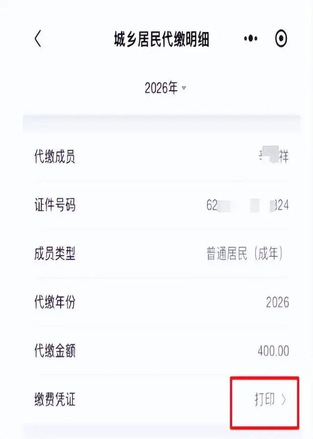 第五步:通过家庭共济为亲属办理城乡居民医疗保险代缴后,如需留存缴费凭证,可在【共济管理】中选择【个账城乡居民保险代缴明细查询】,选定对应年度(如2026年度),点击“打印”即可下载缴费证明。