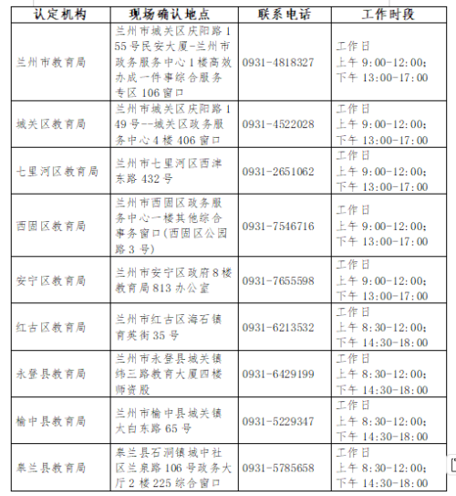 2.幼儿园教师资格、小学教师资格和初级中学教师资格的认定机构为申请人户籍、居住地或就读学校所在地县(区)教育局(其中:兰州新区范围内人员由皋兰县教育局认定、兰州高新区范围内人员由之前行政辖区所属县区教育局认定)。