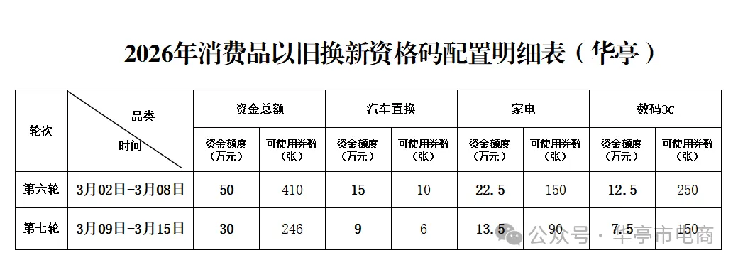 为进一步提升商务领域消费品以旧换新补贴申请透明度,切实做到惠民利企。现将华亭市2026年第六轮、第七轮资格码配置计划公告如下: