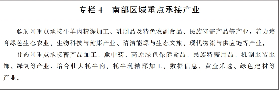(四)打造南部绿色生态产业承接区。甘南州和临夏州围绕筑牢黄河上游生态安全屏障,加快招引特色农副产品加工等产业,推动产业结构持续优化,企业创新发展能力不断提高,品牌影响力显著增强。