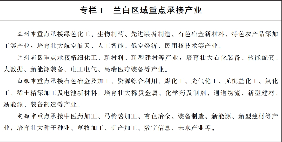 (一)打造兰白区域特色产业承接区。以兰州市为中心,推动兰白区域产业链互补协同,促进强省会资源要素集约化、产业协作高效化。兰州新区立足西北地区重要的经济增长极、国家重要的产业基地、向西开放的战略平台和承接产业转移的示范区,构建创新驱动型产业集群。白银市延伸有色、化工产业链条。定西市强化中医药等特色产业。