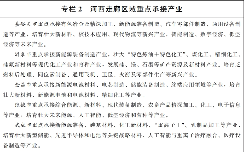 (二)打造河西走廊新兴产业承接区。河西地区以新能源装备、新材料、核技术应用等产业为重点承接方向,推动有色金属和新材料产业集群建设,努力提升产业实力和竞争力。