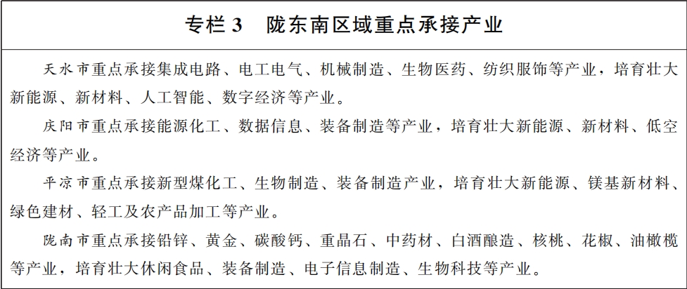 (三)打造陇东南电子信息和能源化工承接区。陇东南地区以电子信息制造、电工电气、能源化工等产业为重点承接方向,推动农产品加工等特色产业转型升级。