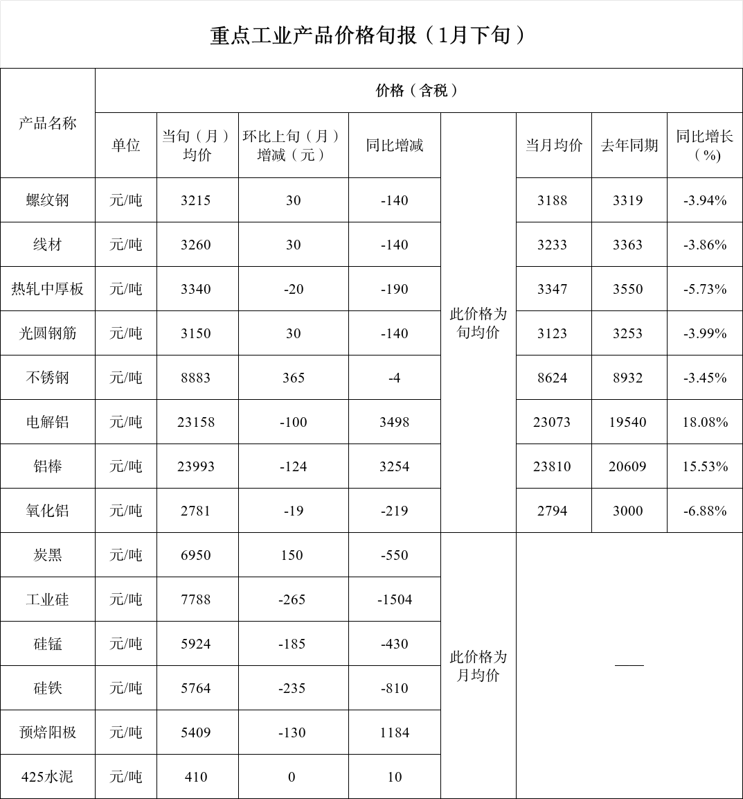 重点工业产品价格旬报(1月下旬)