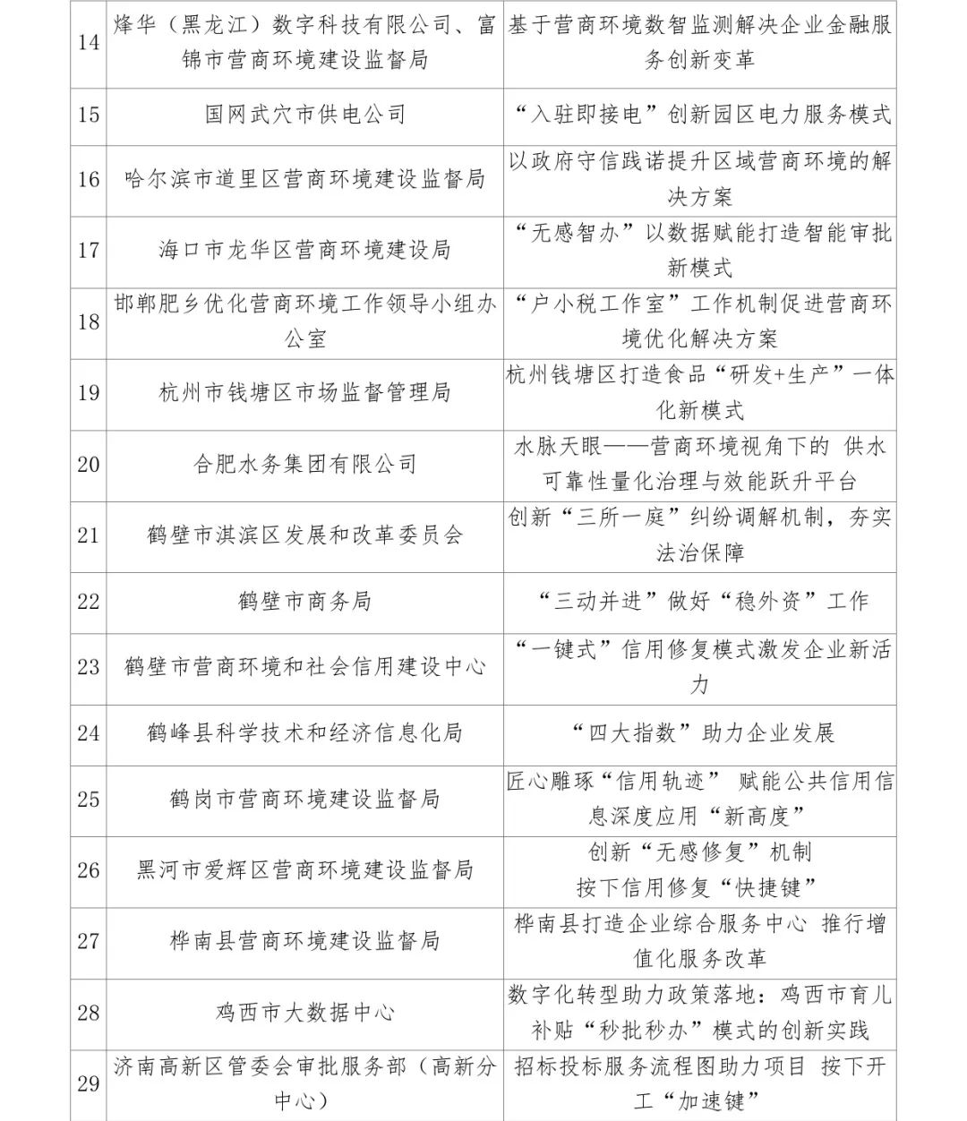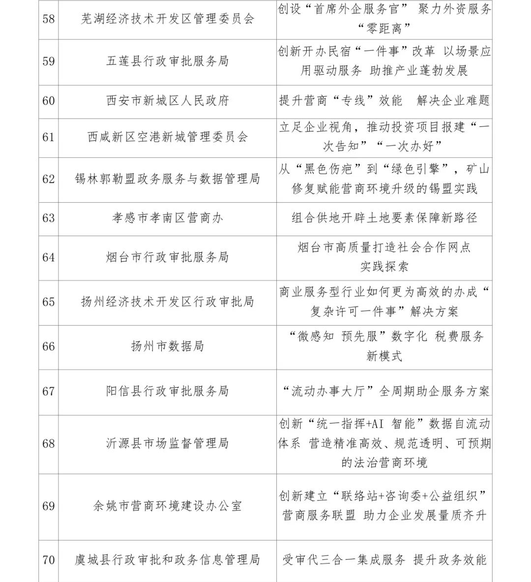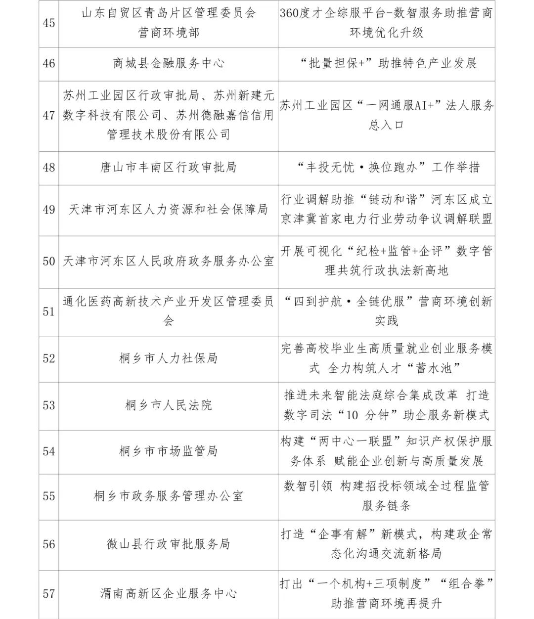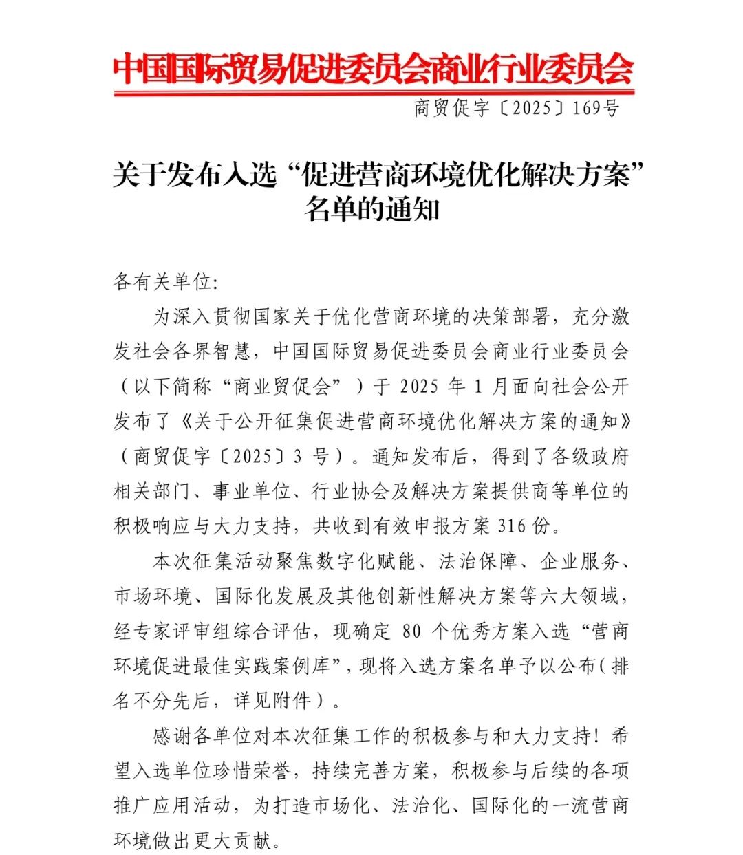 为深入贯彻国家关于优化营商环境的决策部署,充分激发社会各界智慧,中国国际贸易促进委员会商业行业委员会(以下简称“商业贸促会”)于2025年1月面向社会公开发布了《关于公开征集促进营商环境优化解决方案的通知》(商贸促字〔2025〕3号)。通知发布后,得到了各级政府相关部门、事业单位、行业协会及解决方案提供商等单位的积极响应与大力支持,本次征集活动聚焦数字化赋能、法治保障、企业服务、市场环境、国际化发展及其他创新性解决方案等六大领域,经专家评审组综合评估,现确定80个优秀方案入选“营商环境促进最佳实践案例库”,现将入选方案名单予以公布。