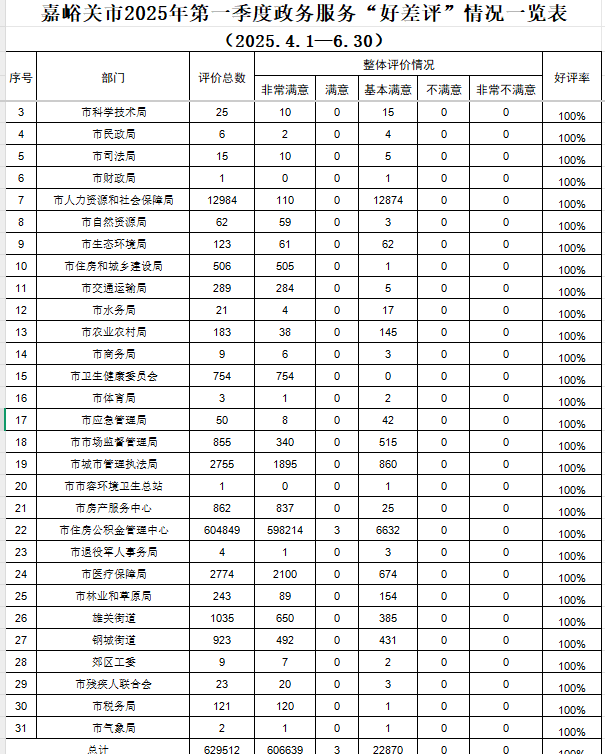 2025年第二季度,我市共收到“好差评”有效评价数629512条,其中,非常满意606639条,好评率100%。现将我市2025年第二季度政务服务“好差评”结果公示如下。