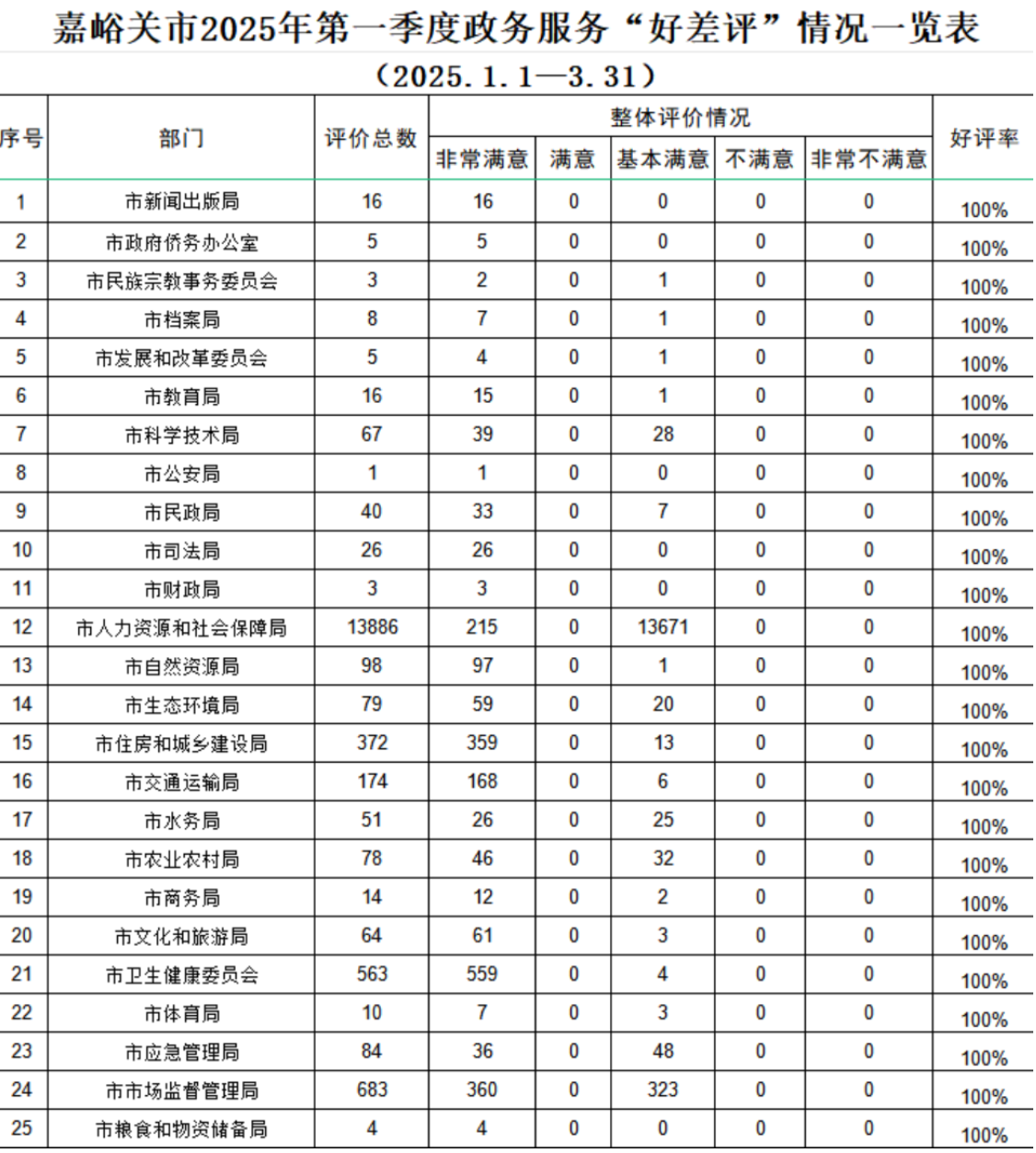 2025年第一季度,我市共收到“好差评”有效评价数401100条,其中,非常满意385457条,好评率100%。现将我市2025年第一季度政务服务“好差评”结果公示如下。