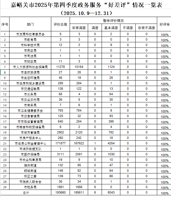 2025年第四季度,我市共收到“好差评”有效评价数193660条,其中,非常满意185611条,好评率100%。现将我市2025年第四季度政务服务“好差评”结果公示如下。