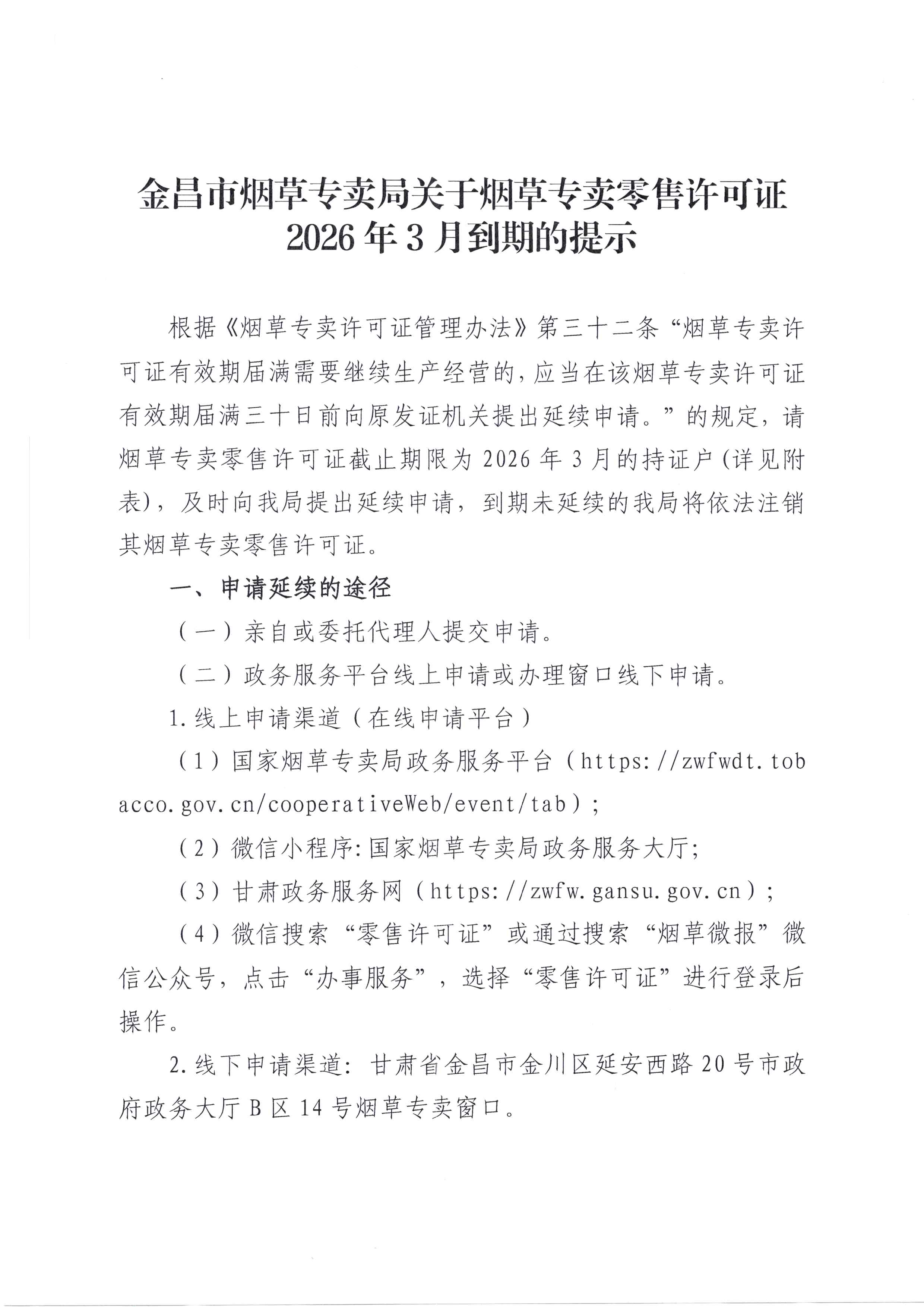 金昌市烟草专卖局关于烟草专卖零售许可证2026年3月到期的提示