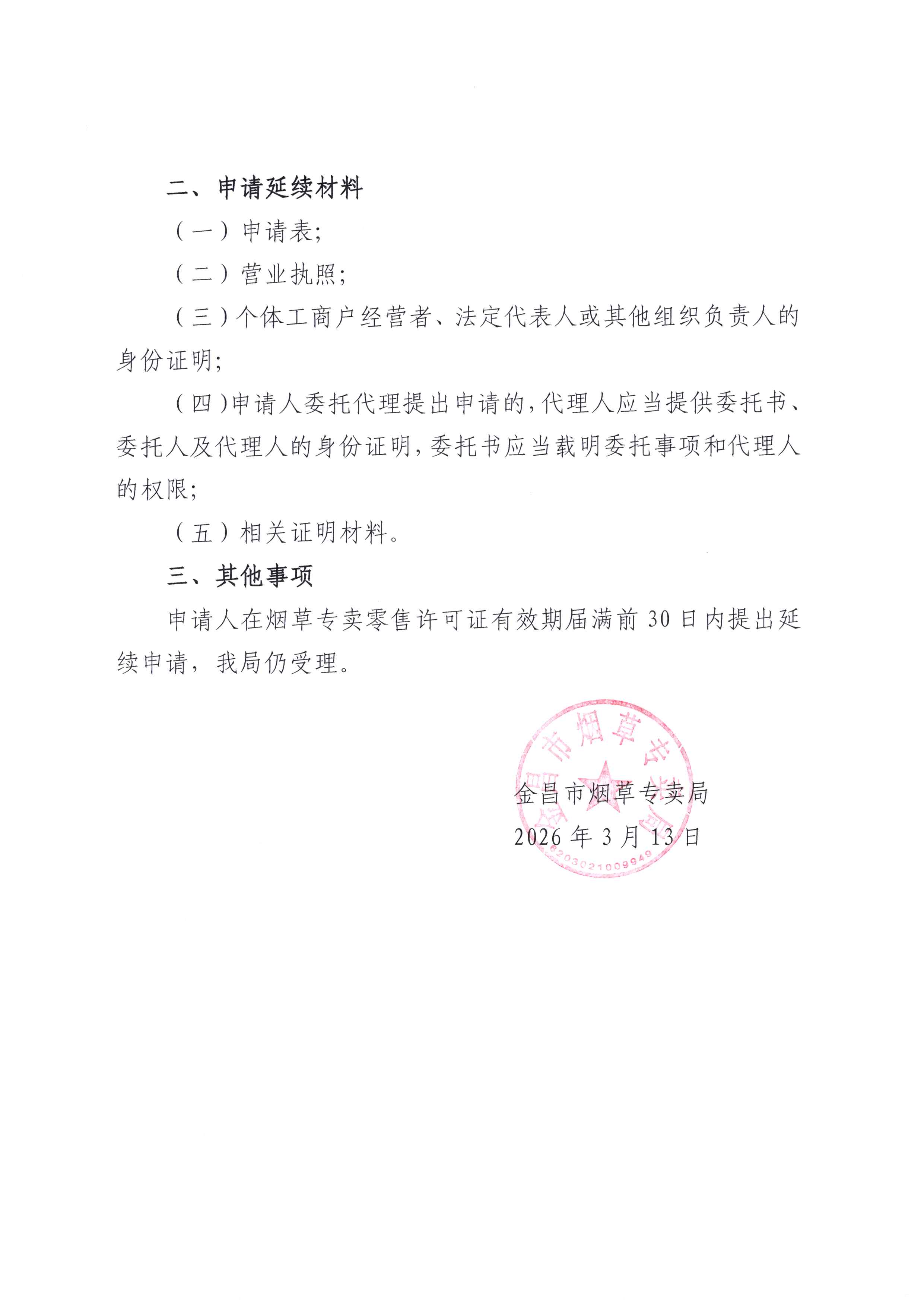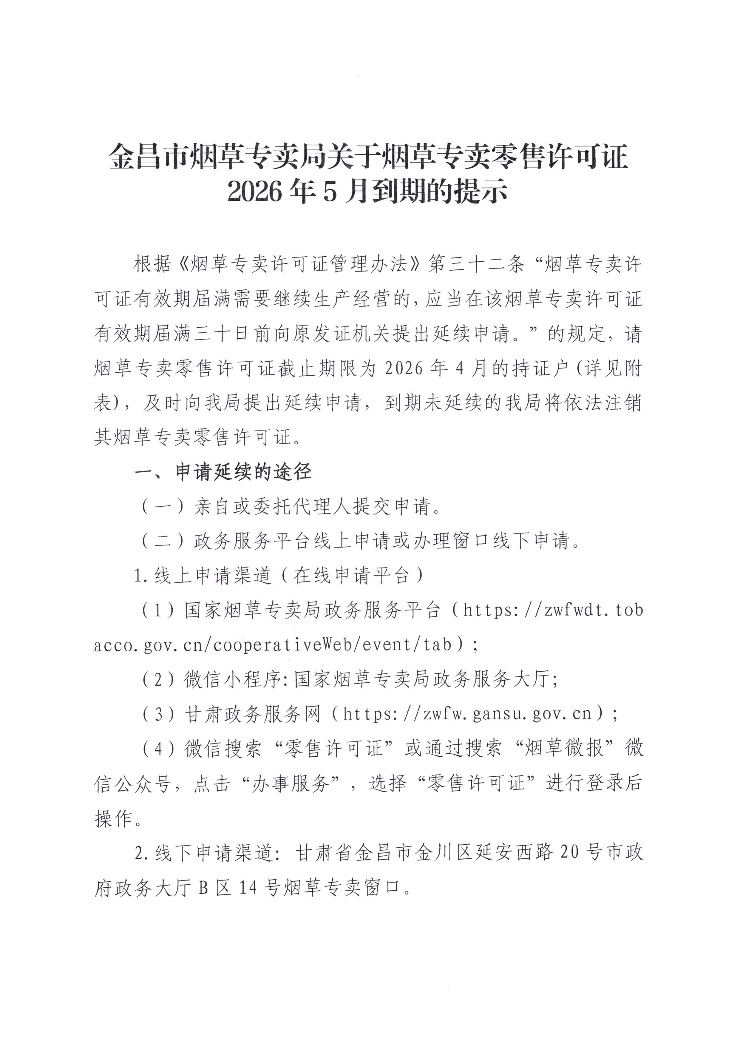 金昌市烟草专卖局关于烟草专卖零售许可证2026年5月到期的提示