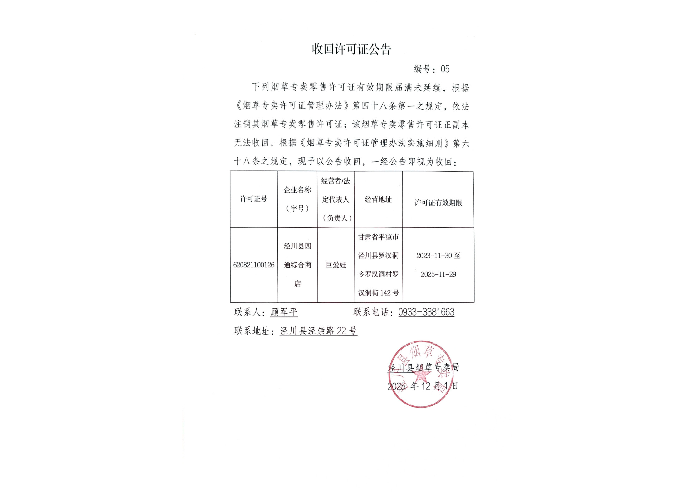 泾川县烟草专卖局收回烟草专卖零售许可证公告