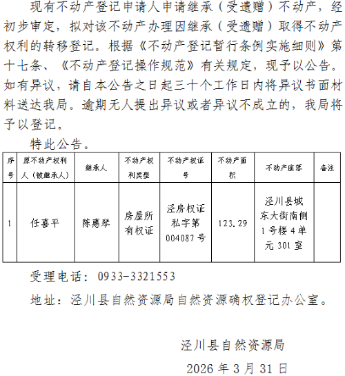 不动产转移(继承)登记公告