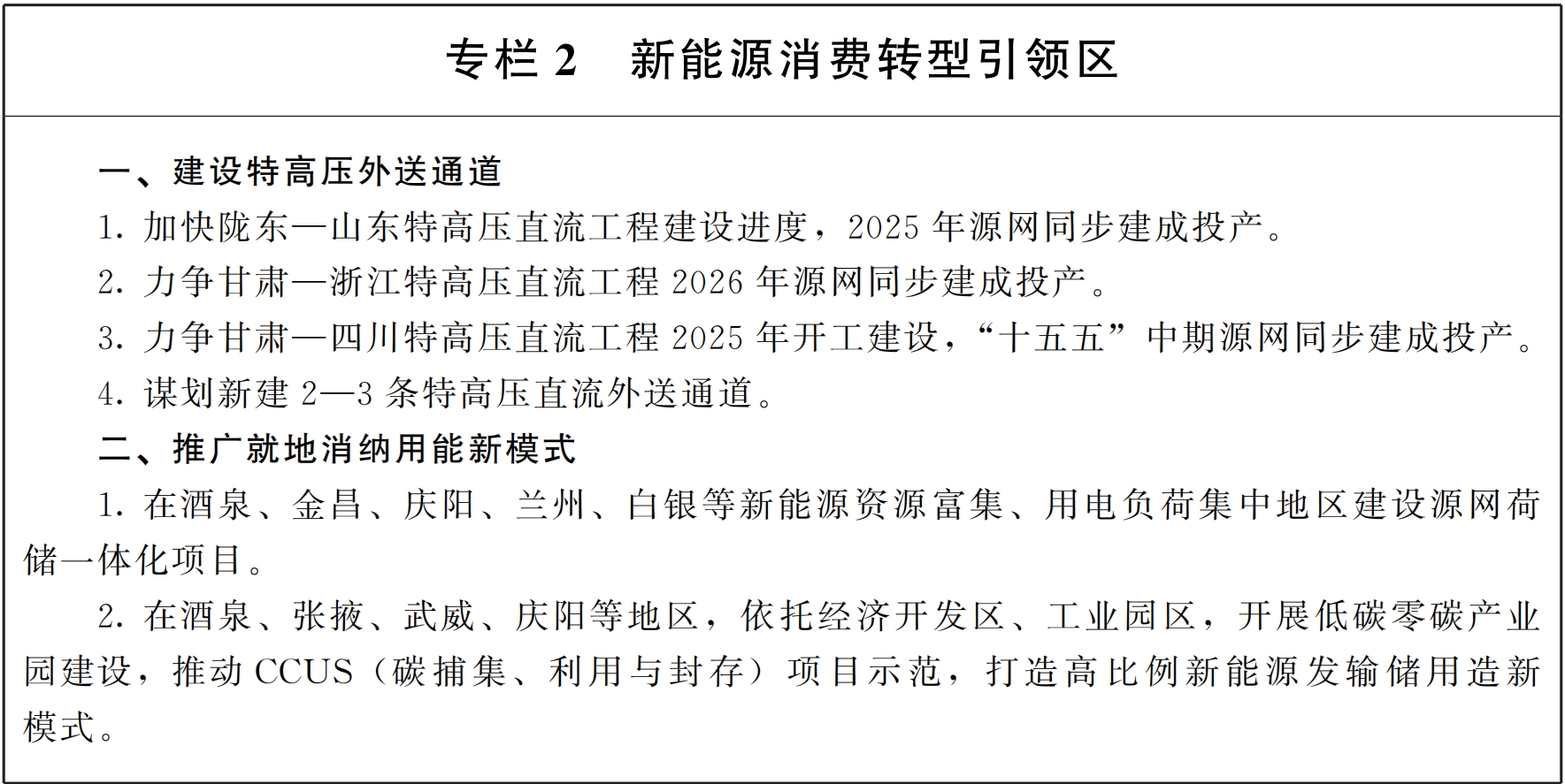 (六)建设特高压外送通道。坚持大型基地、支撑煤电、特高压通道协同发展,加快推动陇电入鲁、陇电入浙、陇电入川工程规划建设,推广柔性直流输电先进技术。谋划建设库木塔格沙漠、腾格里沙漠二回、巴丹吉林沙漠二回等外送输电通道。试点开展新型交直流输电技术应用。(责任单位:省能源局、国网甘肃省电力公司)