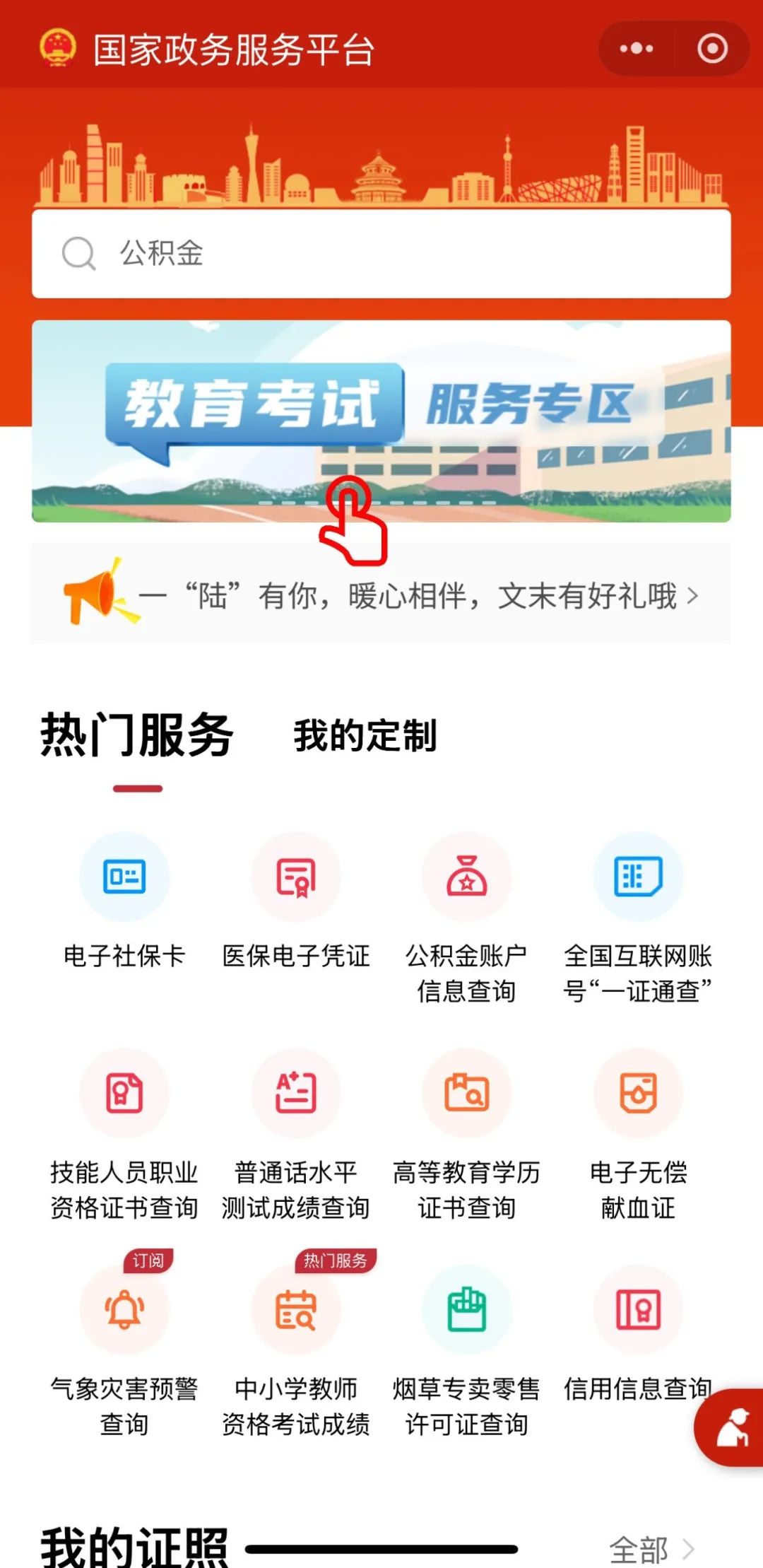 第一步:识别下方葵花码进入教育考试服务专区,或微信搜索国家政务服务平台进入小程序首页,找到教育考试服务专区;