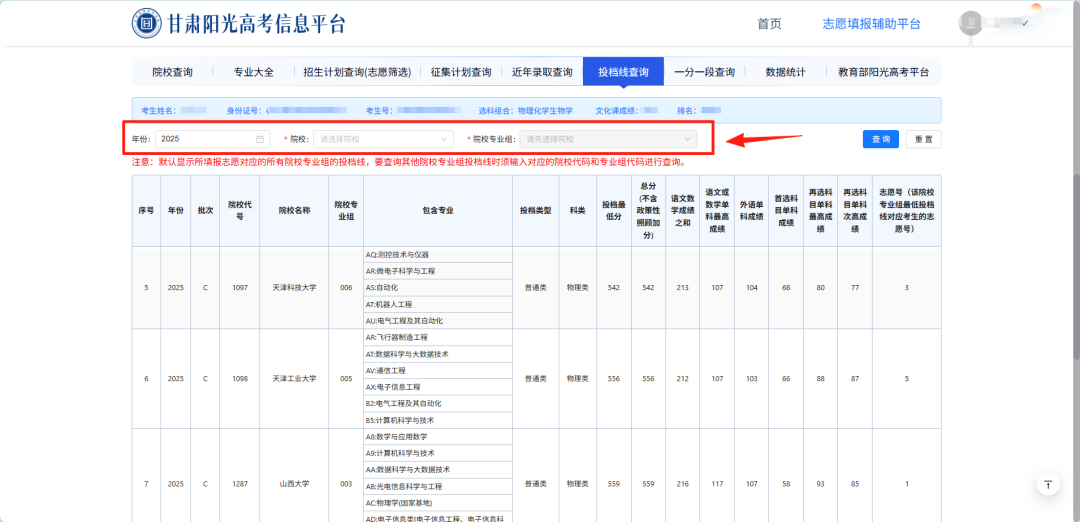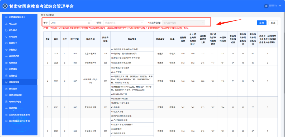 一、投档线查询方式 1.甘肃省国家教育考试综合管理平台查询 考生可访问甘肃省教育考试院官网(https://www.ganseea.cn),点击“甘肃省国家教育考试综合管理平台”,选择“考生入口”,登录后点击左侧“投档线查询”菜单进行查询。 2.甘肃阳光高考信息平台查询 登录甘肃省教育考试院官网(https://www.ganseea.cn),点击“甘肃阳光高考”图标进入甘肃阳光高考信息平台,点击首页“投档线查询”图标登录后查询投档线。 考生可查看自己所填报志愿对应的所有院校专业组的投档最低分,如考生报了C段45个志愿,点击“投档线查询”系统会自动匹配该考生所报45个院校专业组的投档最低分。 同时,考生在上述系统内,可以输入院校名称或者院校代号,查询自己未填报院校专业组的投档最低分。 二、录取结果查询方式 1.甘肃省教育考试院官网查询 访问甘肃省教育考试院官网(https://www.ganseea.cn),点击“信息查询”模块进入“高考录取查询”页面进行查询;亦可点击甘肃省教育考试院官网“甘肃省国家教育考试综合管理平台”长图,点击“考生入口”登录后进行查询。 2.“甘肃招考”微信小程序查询 微信搜索“甘肃招考”小程序,进入首页后点击“普通高考”图标,登录后点击“录取查询”图标进行查询。 3.甘肃省教育厅微信公众号查询 微信搜索“甘肃省教育厅”微信公众号,进入“高考录取查询”进行查询。 4.甘肃政务服务网查询 访问甘肃政务服务网,在省本级站点首页“为您推荐”栏目点击“甘肃省普通高考录取查询”模块进行查询。 5.“甘快办”APP查询 访问“甘快办”APP,在省本级站点搜索“高考服务专区”,在专区内进行查询。 三、特别提醒