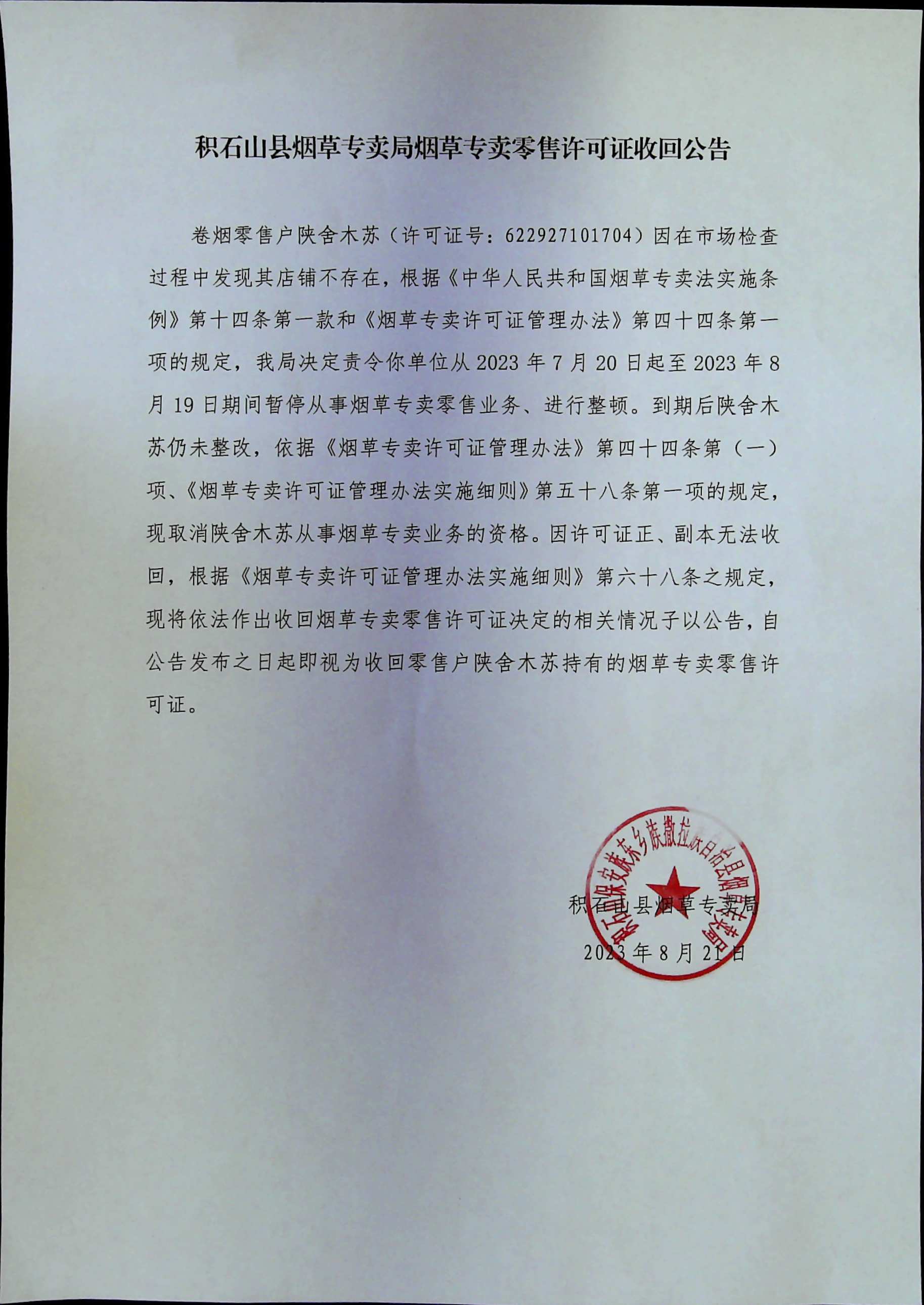 积石山县烟草专卖局烟草专卖零售许可证收回公告