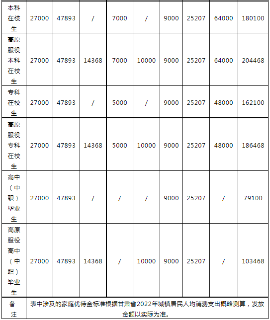 ⑴家庭优待金:义务兵服役期间,按上年度全省城镇居民人均消费支出(2022年甘肃省为25207元)95%发放,共发放两年。义务兵家属按照规定享受军属优待。