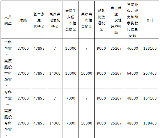 ⑵高原服役奖励金:志愿到高原地区服役的,一次性发放10000元奖励金,并增发30%义务兵家庭优待金。