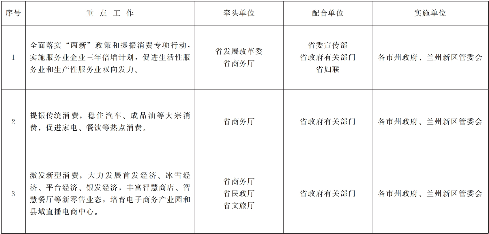三、协同联动抓实施。各牵头单位要切实履行好牵头抓总、组织协调、统筹推进职责,对分解表中明确的责任事项,定期开展跟踪调度,研究解决突出问题,切实打通执行落实层面的堵点卡点。各配合单位要强化系统观念和协作意识,积极履职尽责,做到同题共答、同频共振、同向发力。各地要切实履行属地责任,主动对接省直有关部门,结合本地实际创造性抓好贯彻落实,力争取得最好成绩。